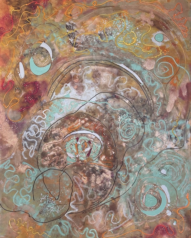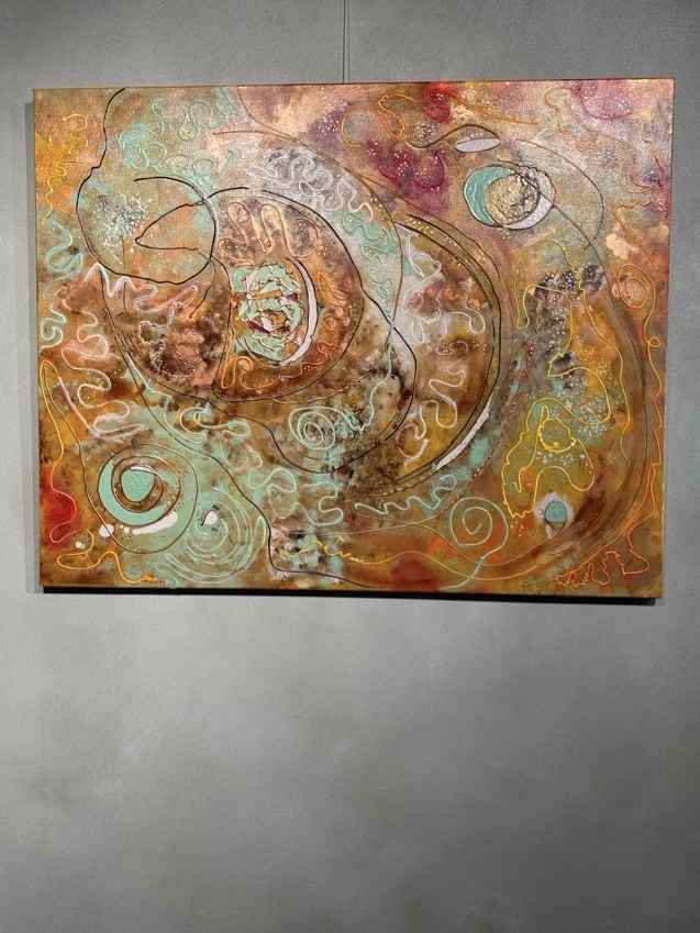 Obraz “Tajemství” vás vtahuje do mystického světa plného skrytých symbolů a jemných linií, které se proplétají v neustálém tanci. Teplé tóny hnědé a zlatožluté se prolínají s chladnějšími odstíny tyrkysové, vytvářejíce atmosféru hlubokého tajemství. Tento obraz vnese do prostoru pocit zkoumání a objevu, jako by ukrýval příběh čekající na odhalení.