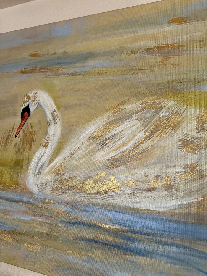 Obraz “Kouzelná labuť” ztělesňuje eleganci a klid této majestátní bytosti, která se jemně pohybuje po hladině vody. Zlato a jemné tahy štětce vytvářejí dojem třpytu na vodní hladině, zatímco labuť zůstává tichým symbolem krásy a vznešenosti. Tento obraz vnese do prostoru harmonii a kouzlo přírody, které uklidňuje a inspiruje.