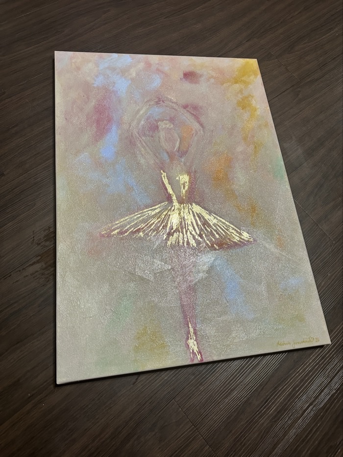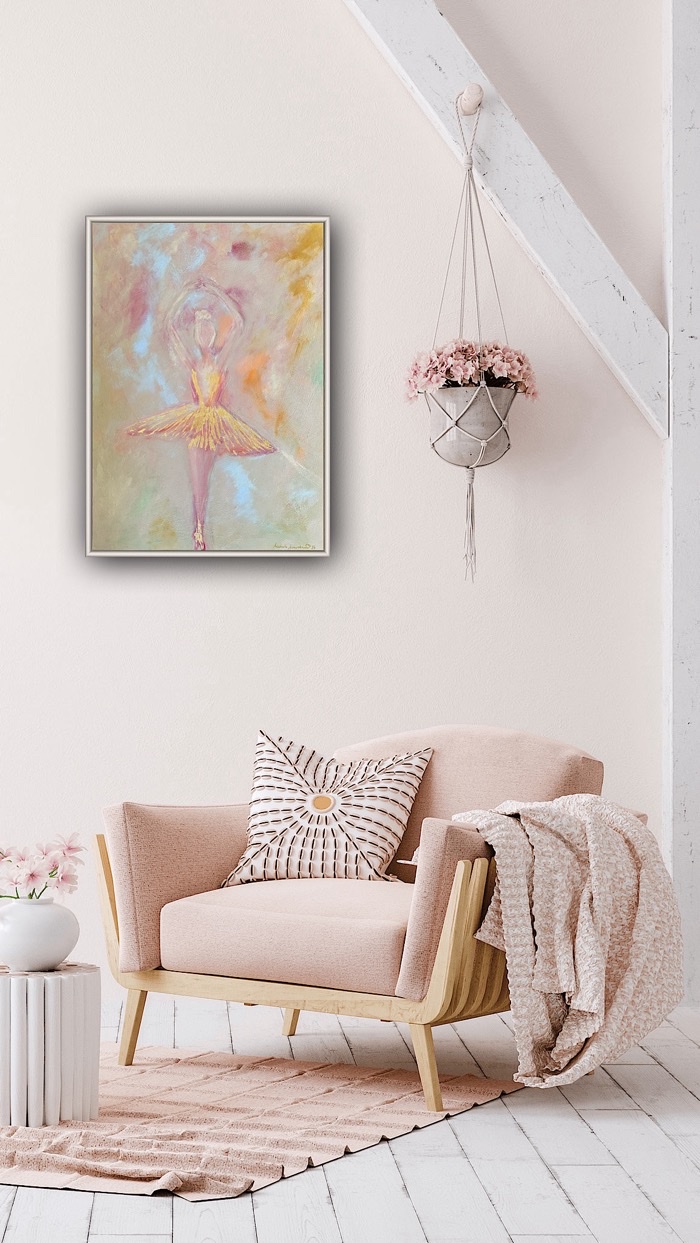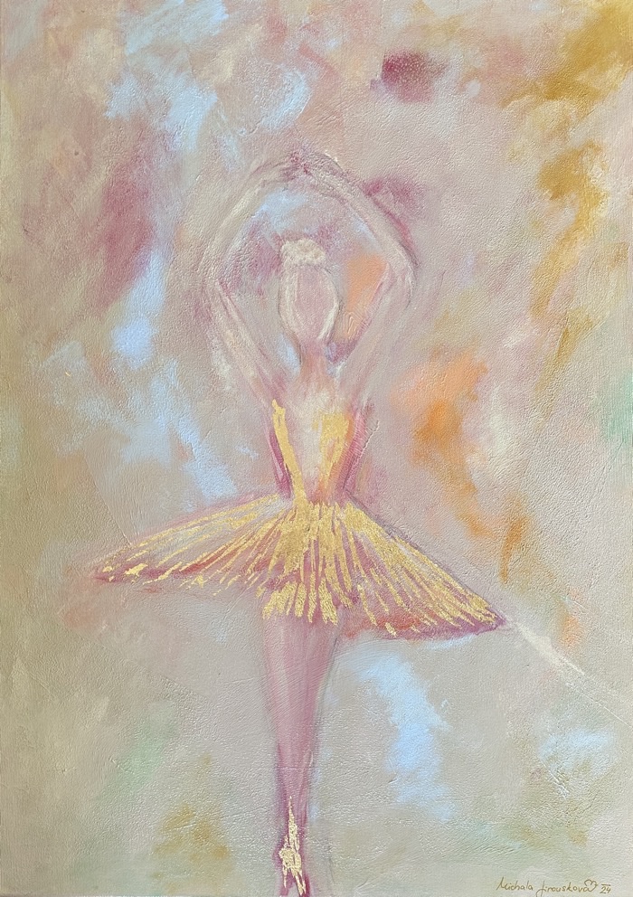 Obraz “Balerína” ztvárňuje jemnost a ladnost tanečního pohybu, kde se silueta baletky ztrácí v éterických tónech růžové a zlaté. Tanečnice jako by se vznášela na okraji snu, její půvabná pozice a měkké linie odrážejí eleganci a klid. Tento obraz přinese do prostoru harmonii a jemnou krásu, evokující kouzlo baletního světa.