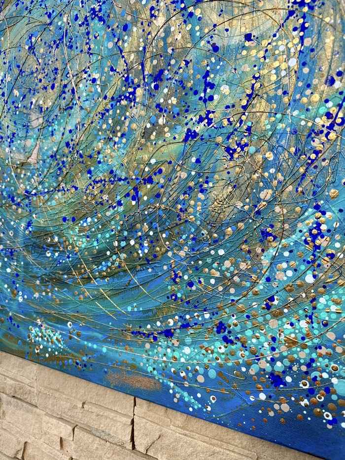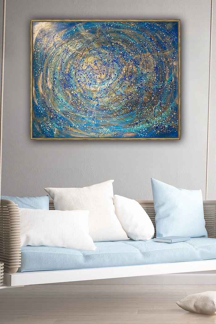 Obraz “Ztracená hvězda” vás zavede do vesmírného víru plného světel a energií. Modré a zlaté kruhy vytvářejí hypnotizující spirálu, v jejímž středu se ztrácí malá, zářící hvězda. Tento obraz je jako okno do hlubin galaxie, připomínající nekonečné hledání a krásu ztracených pokladů ve vesmíru. Přináší do prostoru harmonii a tajemství, která lákají k objevování.