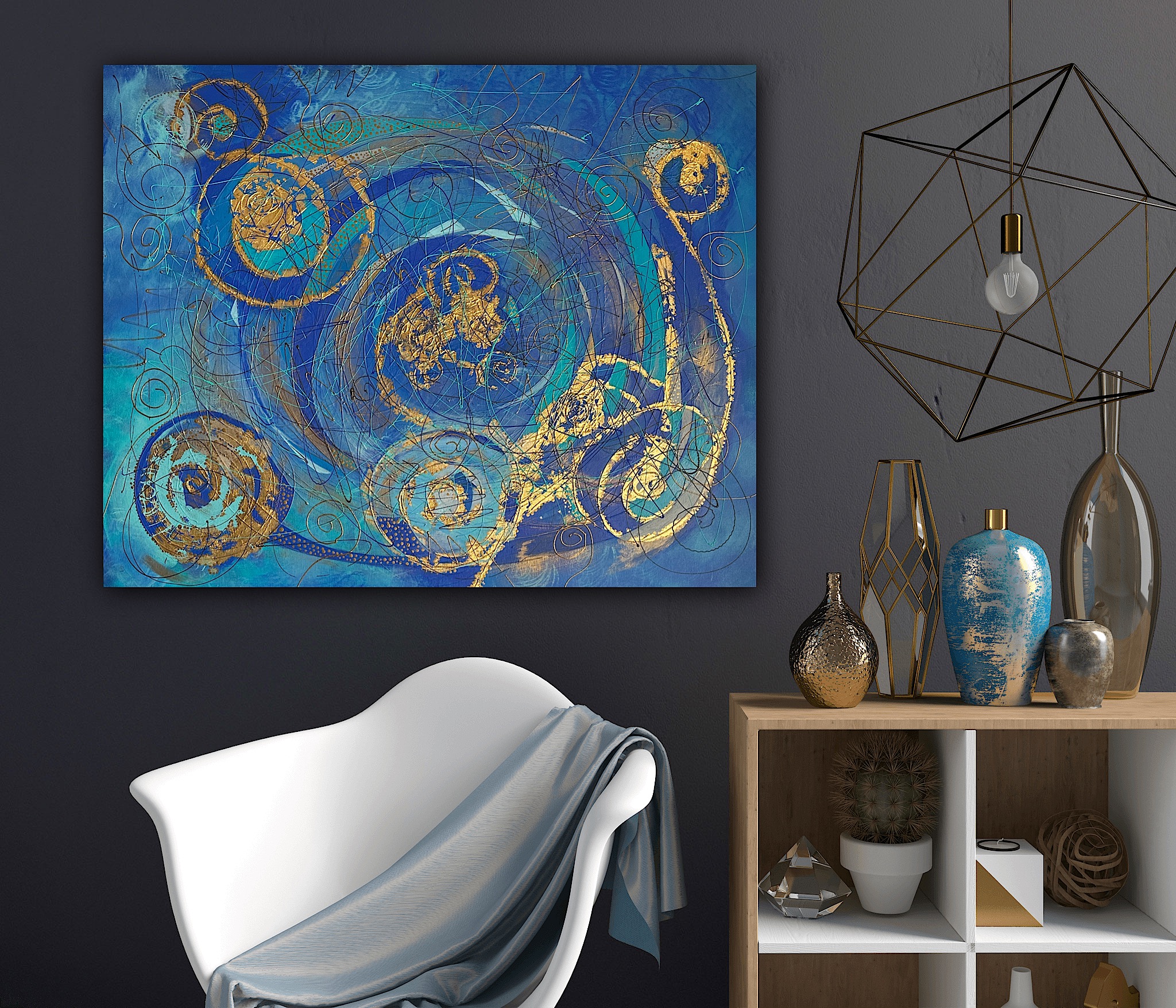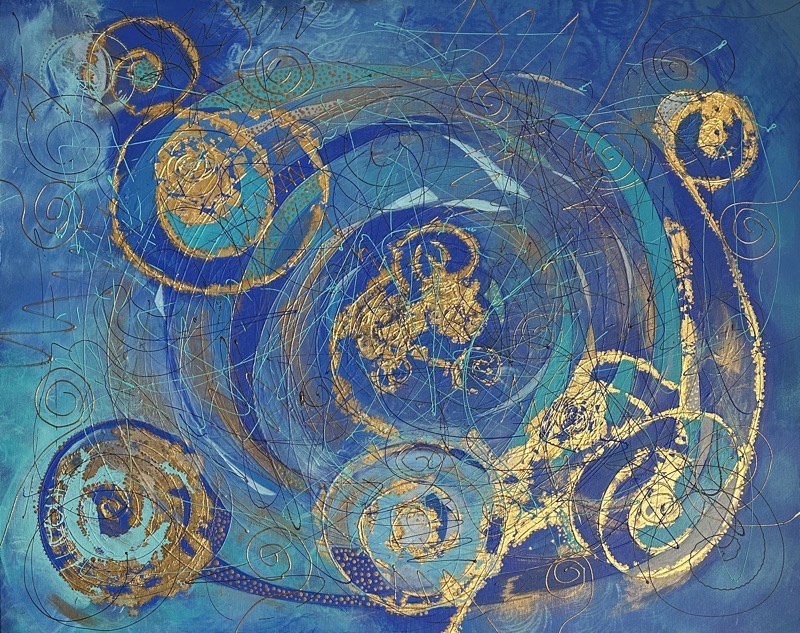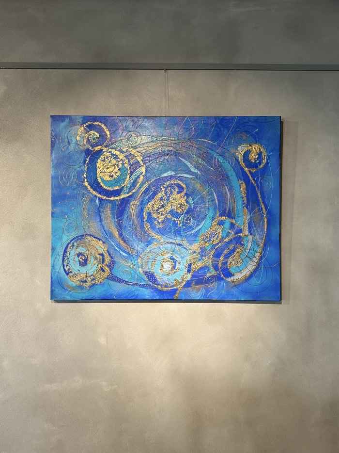 Obraz “Zrodila se hvězda” oslavuje okamžik, kdy se ve vesmírném víru rodí nová hvězda. Spirálové linie v odstínech modré a zlaté znázorňují dynamiku a energii, která proudí středem a rozprostírá se do okolí. Tento obraz přináší do prostoru pocit naděje a zázraku, připomínající, že každý začátek má své kouzlo.