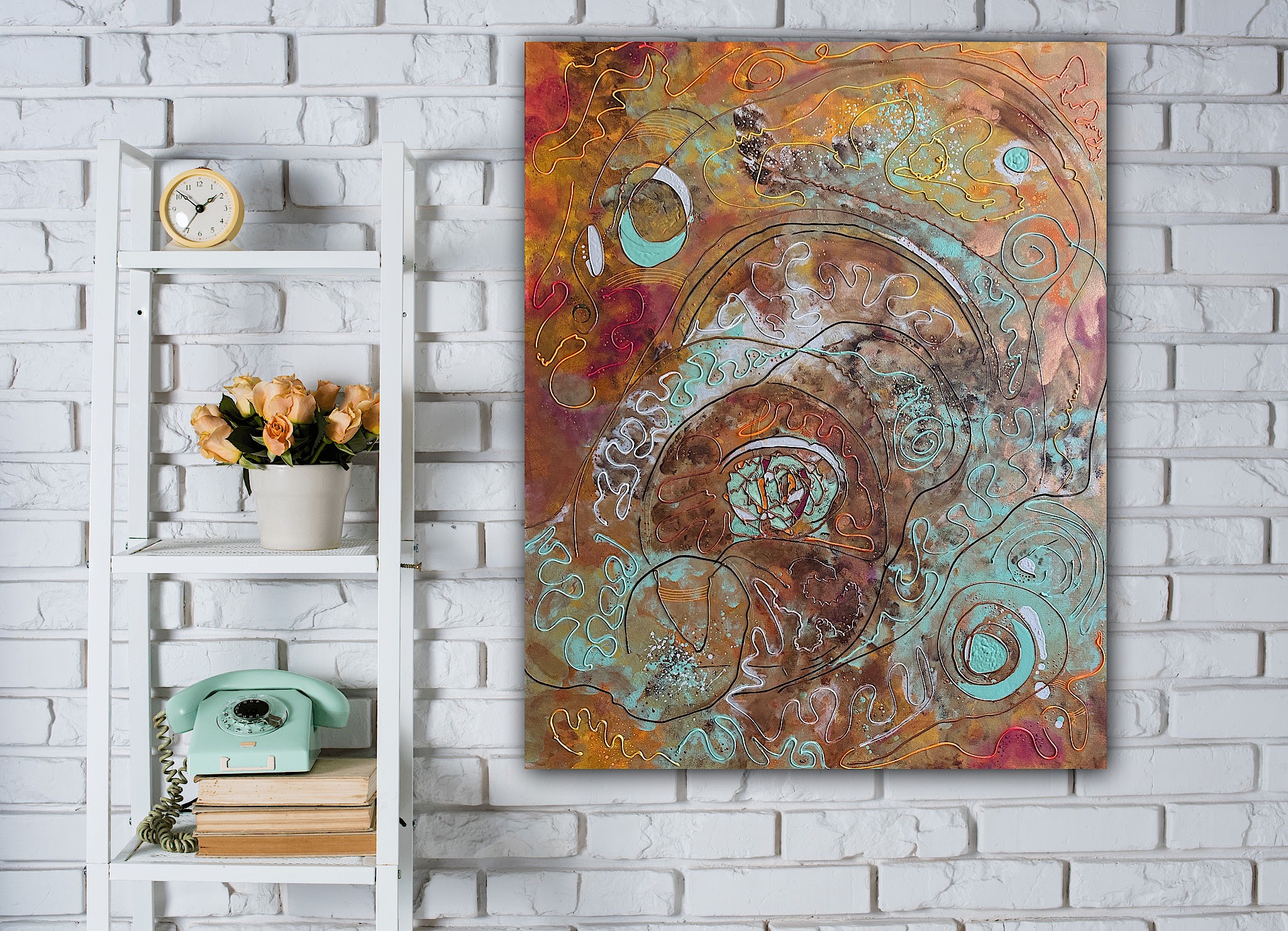 Obraz “Tajemství” vás vtahuje do mystického světa plného skrytých symbolů a jemných linií, které se proplétají v neustálém tanci. Teplé tóny hnědé a zlatožluté se prolínají s chladnějšími odstíny tyrkysové, vytvářejíce atmosféru hlubokého tajemství. Tento obraz vnese do prostoru pocit zkoumání a objevu, jako by ukrýval příběh čekající na odhalení.